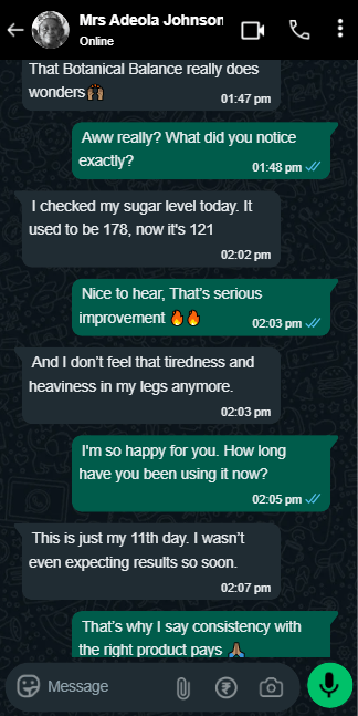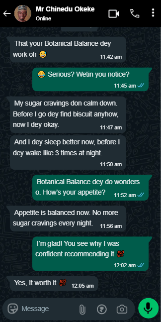 "Before I started using Botanical Balance, I used to feel weak after small activities. Even after eating, I’d still feel tired and sleepy. But after two weeks, I noticed a big change. My cravings reduced, I have more energy, and I now go through my day without crashing. I’m so grateful!"